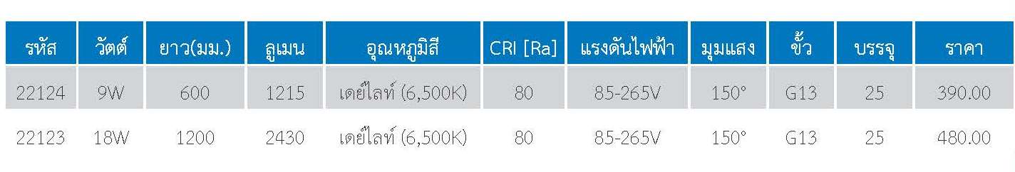 คุณสมบัติ • สะดวกปลอดภัยต่อการใช้งาน • ใช้ทดแทนหลอดฟลูออเรสเซนซ์ได้ง่าย • สว่างมากกว่าหลอด LED T8 ทั่วไปถึง 50% • ให้คุณภาพสีที่ดีกว่าด้วย CRI [Ra] มากกว่า 80
