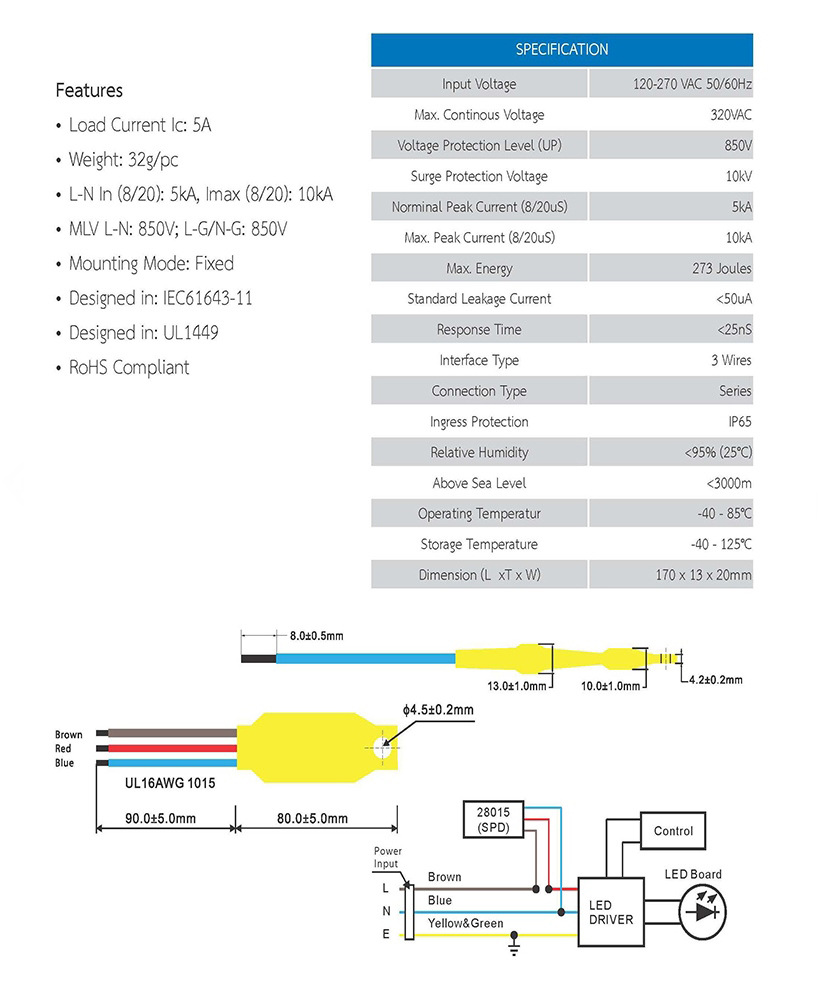 อุปกรณ์ป้องกันฟ้าผ่า และไฟกระชาก ได้รับการออกแบบมาเป็นพิเศษเพื่อใช้ป้องกันไฟฟ้าลัดวงจร และความเสียหายจากอัคคีภัย รวมไปถึงป้องกันฟ้าผ่าสำหรับระบบแสงสว่าง LED และไฟลัดวงจรได้อย่างมีประสิทธิภาพ มีความปลอดภัยสูง สินค้าได้รับมาตรฐาน IEC61643-11 และ CE การใช้งาน · ใช้งานร่วมสำหรับอุปกรณ์โคมไฟ LED สำหรับงานกลางแจ้ง, ไฟจราจร, สัญญาณไฟดิจิตอล, ไฟถนน และไฟ LED ทั่วไป · รับประกันสินค้า 5 ปี ![]() ![]() |